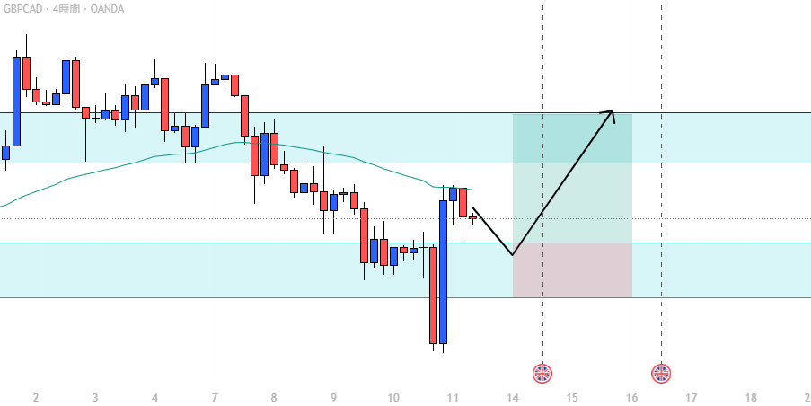 4時間足では大陽線によって上目線に切り替わった直後。AOI付近で反発すれば逆三尊が成立し、さらにレジサポ転換の形にもなるため、上昇の根拠が強まります。押し目を丁寧に狙いたい場面です。
