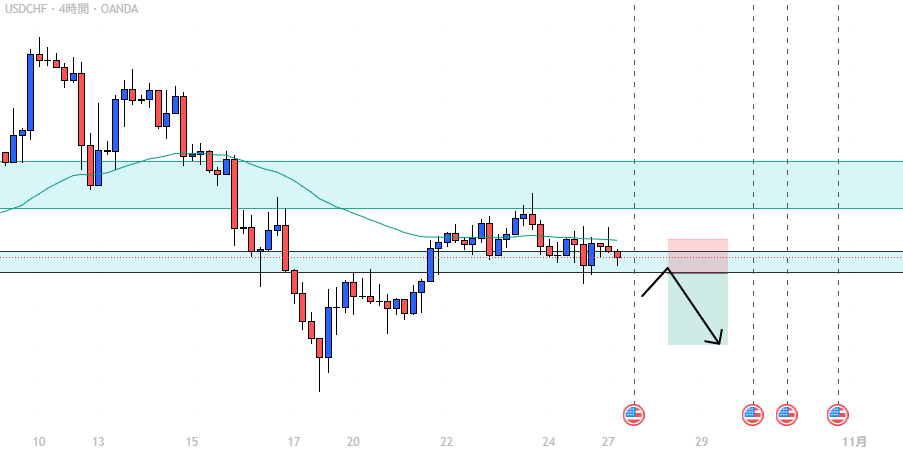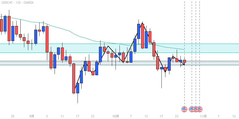- USD/CHF: 複数時間足で三尊形成。ネックライン割れに注目。
