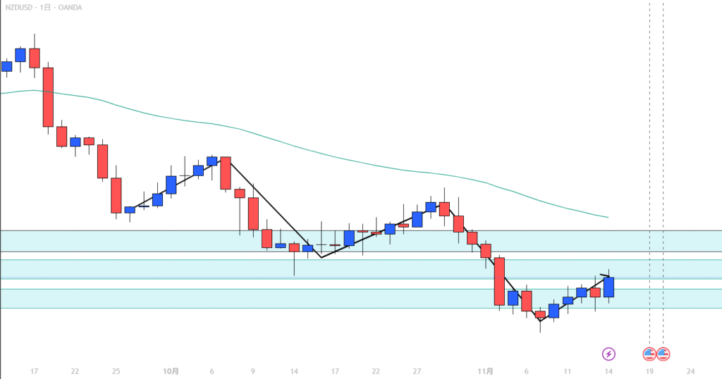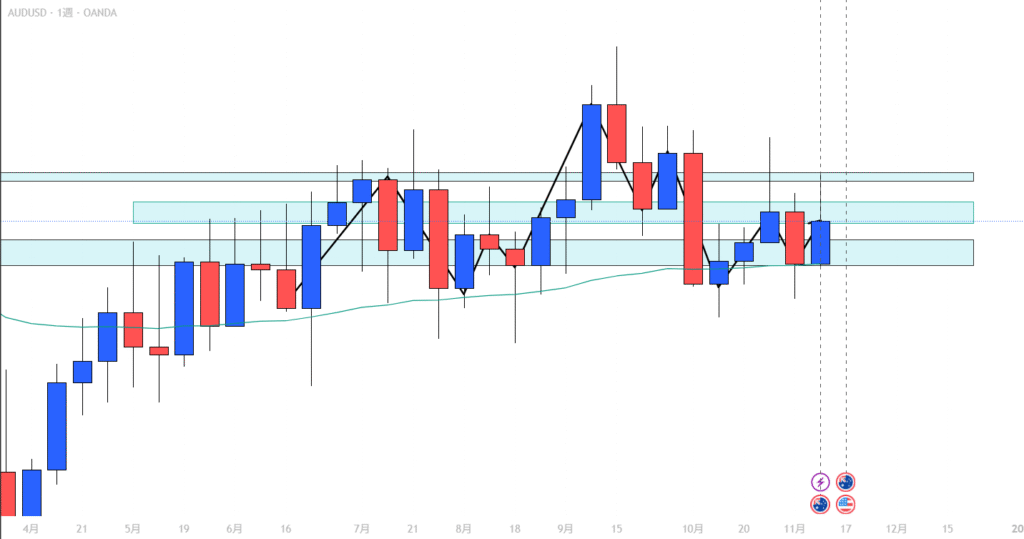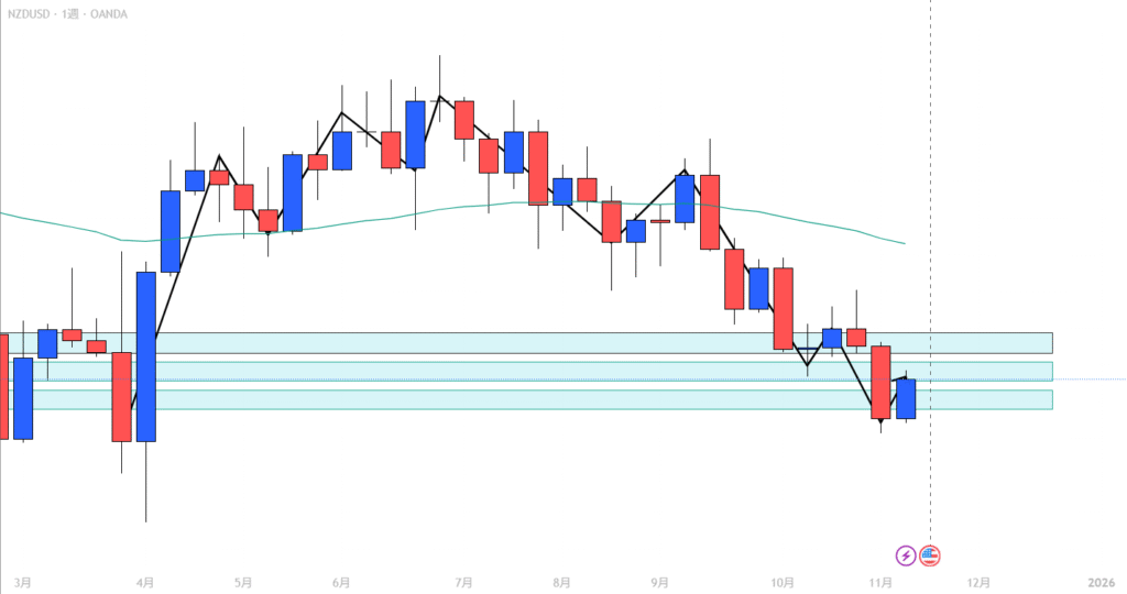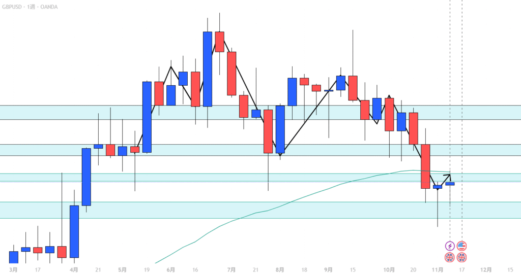 週足は下降トレンドの中で、現在はAOIまで戻してきている状況です。 まだEMAとの距離があるため、今週は動きが停滞する可能性もありますが、トレンド再開の起点となる重要局面です。