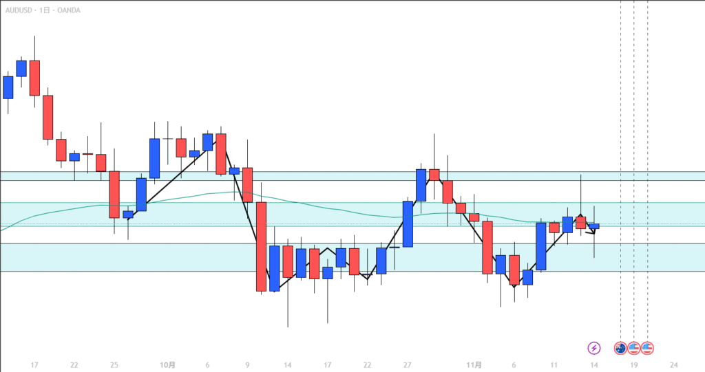 下降トレンドが継続中で、AOIが近い位置に並んでいます。 どのAOIで反発するかが今週の焦点となります。