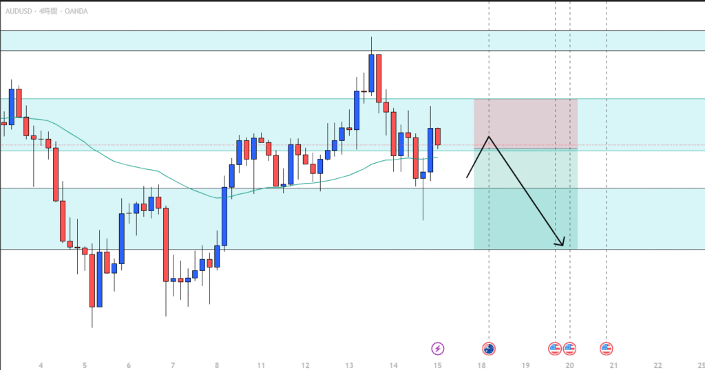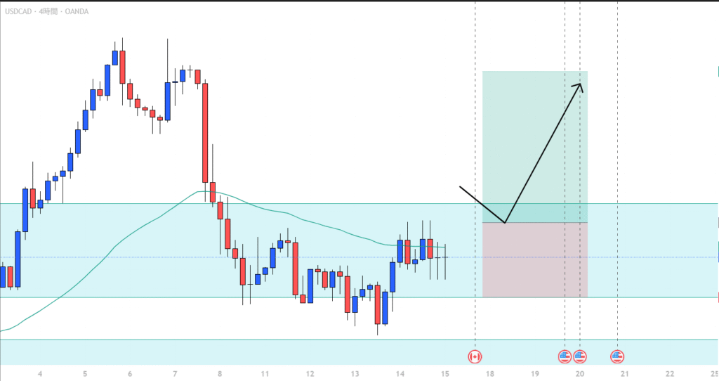 4時間足も上目線ですが、下からAOIへ進入しているため現状ではエントリー不可。 理想は一度上に抜けてから戻りを作り、再び上昇していく動きを拾う形です。