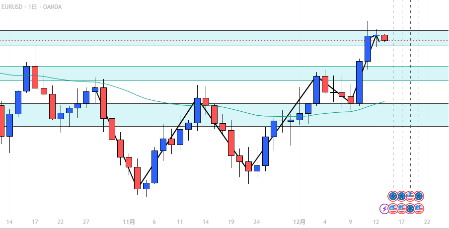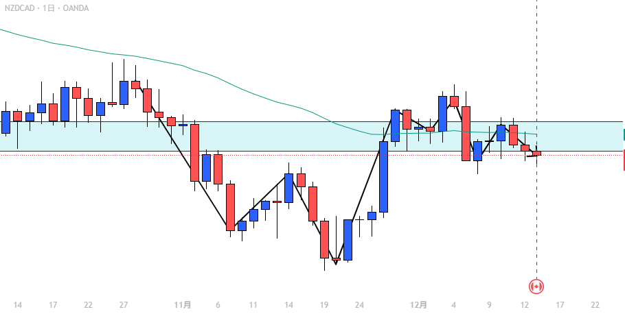 日足では上昇トレンドが出ており、AOI・EMA・前回高値が重なる押し目候補に到達しています。週足と日足の見方が分かれるため、下位足のプライスアクションが非常に重要です。