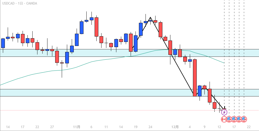 週足は先週の確定足で安値を更新し、下降トレンドに移行しています。下方向へのバイアスは強いものの、EMAがすぐ下にあり何度もサポートされている点には注意が必要です。