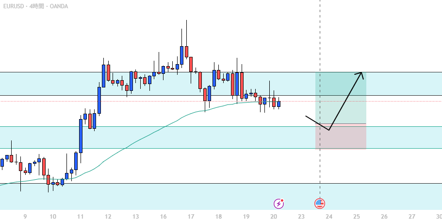 4時間足では下目線のレンジが続いています。 日足の押し安値付近で買い支えが強いため、明確に抜けてからエントリーを検討した方が確実です。