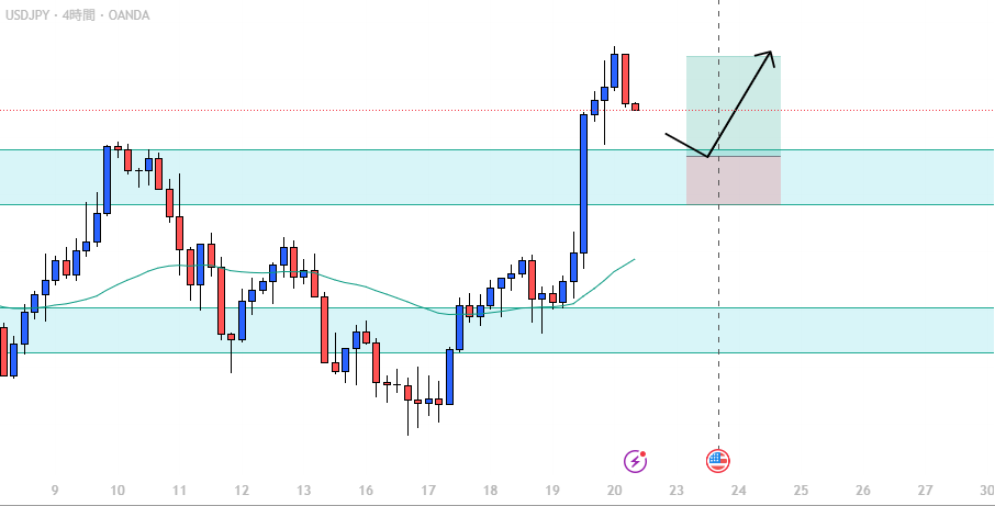日足ではきれいな上昇トレンドを維持し、現在は調整の戻し局面です。 AOI到達時にはEMAも追いついてくるため、押し目として非常に良い位置になりそうです。