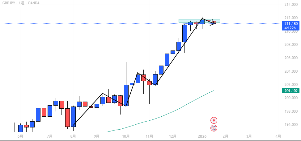 週足では長期的な上昇トレンドが継続しています。 ただし上昇が続いている分、大きな調整が入るリスクにも注意が必要です。