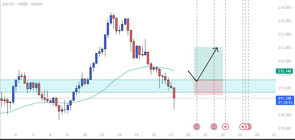 4時間足でも大きく上昇した後、AOIまで戻しています。 一度下に抜けてきているため、再度上抜け後のリテストを待ってからエントリーしたい場面です。