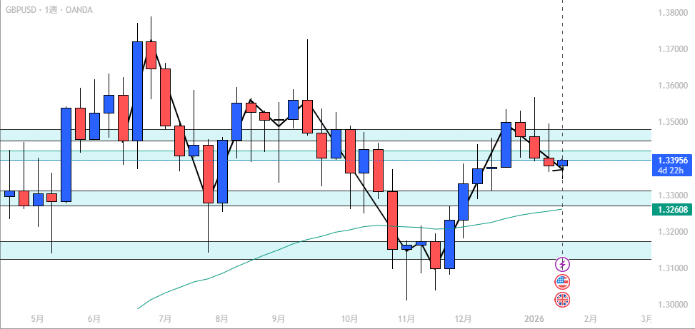 週足では先週、押し安値を明確に割り込み、下目線へ転換しました。 短期的な戻しが入る可能性はありますが、全体のバイアスは下落方向と考えられます。