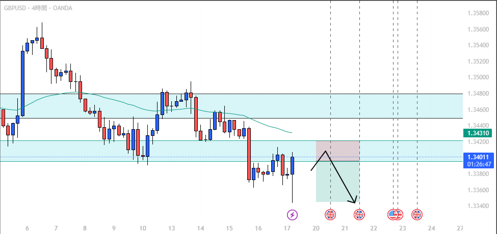 4時間足でも下目線のままレンジを形成しています。 下位足の値動きを確認しつつ、レンジブレイクの初動を待ちたいところです。