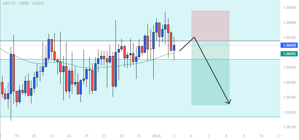 4時間足ではダブルトップから押し安値を割り、下目線へ転換しています。 流動性次第では初動を狙える場面ですが、焦らず下位足の動きを確認してから仕掛けたいところです。