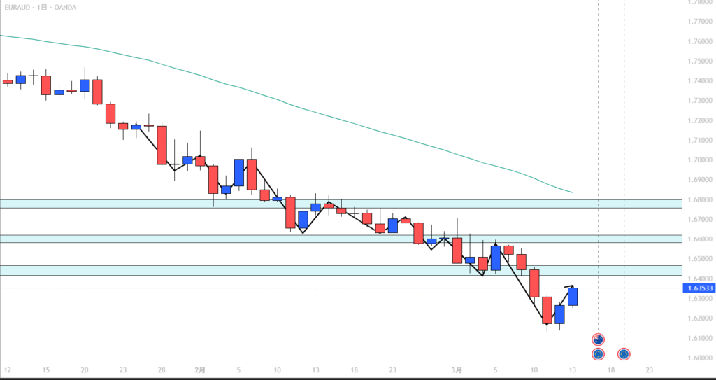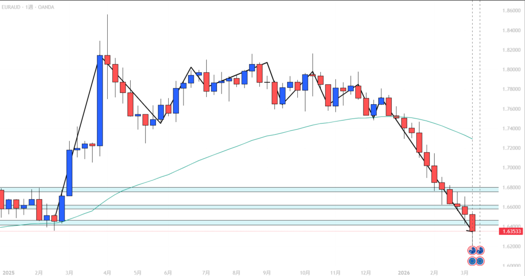 - EUR/AUD: 週足も下目線転換、戻り売り優勢。