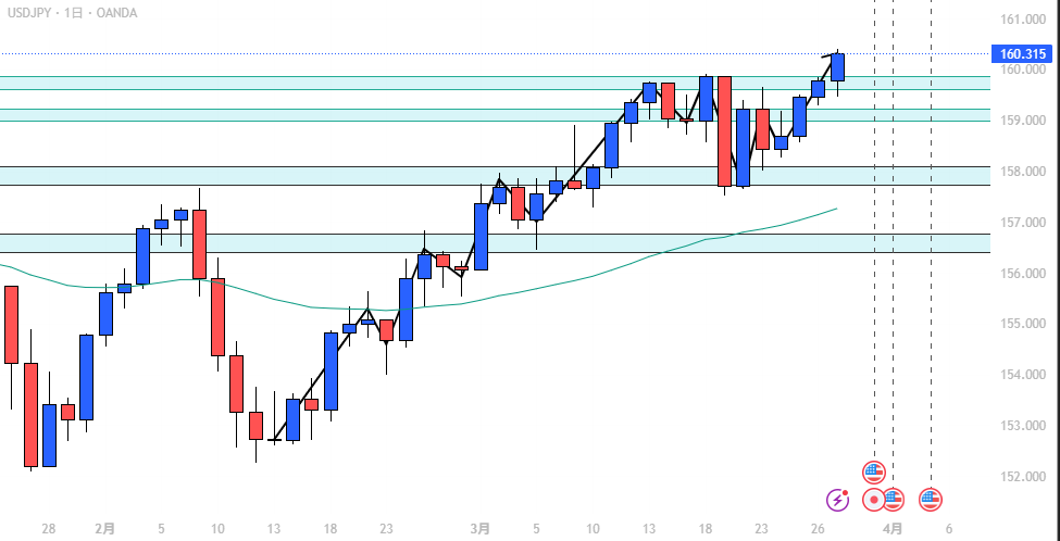 - USD/JPY: 上昇トレンド発生、押し目買い狙い。