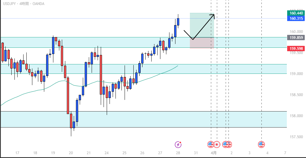 4時間足も上昇トレンドで上位足と一致。