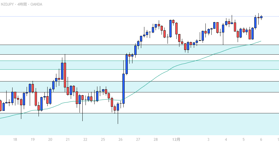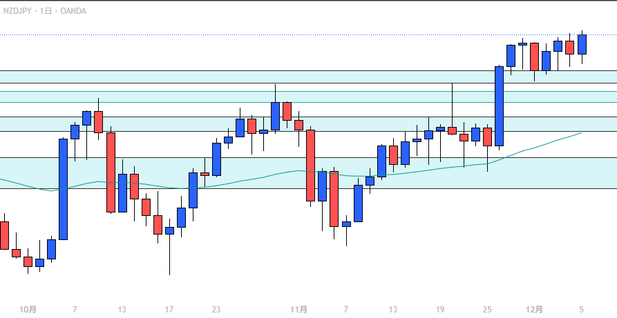 • NZD/JPY: AOIサポート → 完璧な上昇の流れ。