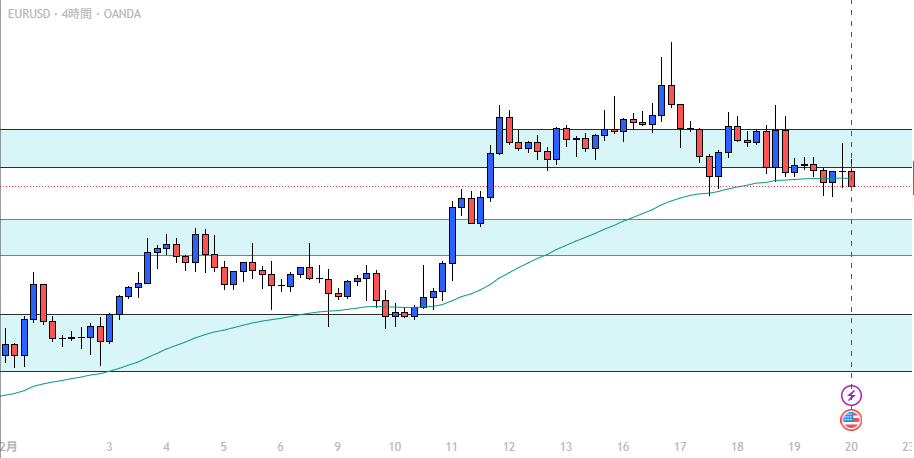 4時間足では高値更新後に押し安値を割り、下目線へ転換。 三尊を伴って下降トレンドとなり、EMAを下抜けたあとは短期的に売りが優勢な展開となっています。