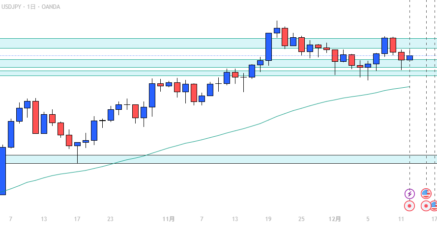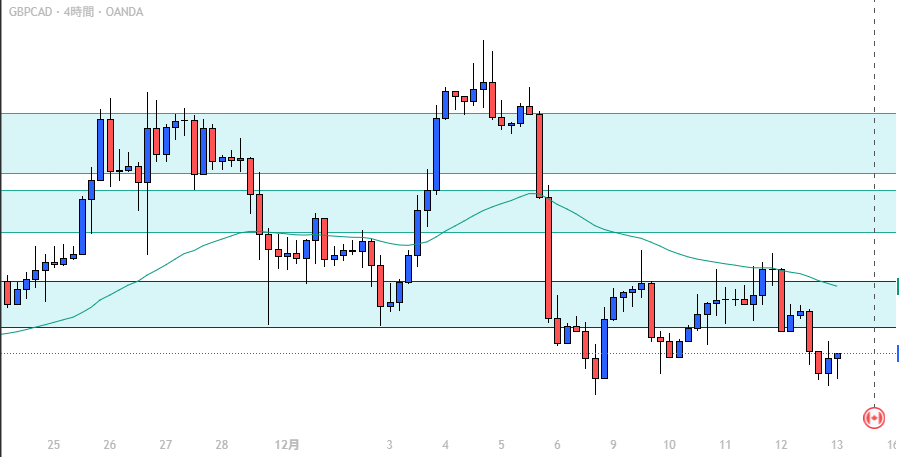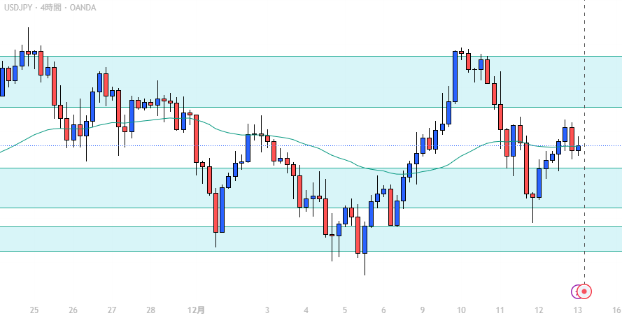 4時間足では一度上目線に転換したものの、三尊を形成して下目線へ再転換。EMAでのロールリバーサルも非常にきれいで、売りが機能しやすい環境となっています。今週も戻り売り目線が有効そうです。