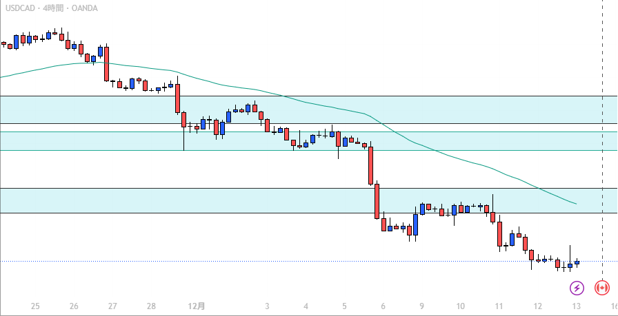 4時間足では一時的に上昇トレンドが出たものの、EMAでレジスタンスされイブニングスターが出現。再び下目線へ転換し、現在は下降トレンドとなっています。AOIとEMAが重なるゾーンでの戻り売りが狙いやすい展開です。