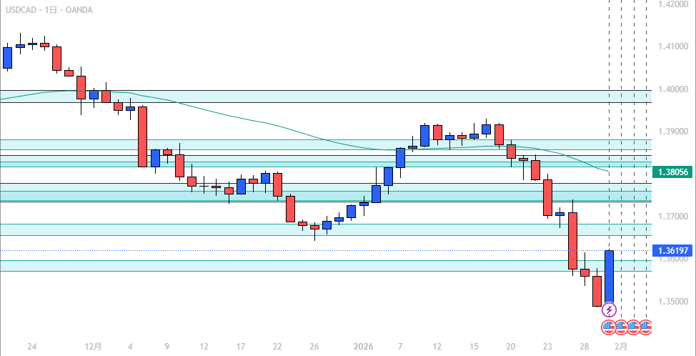 - USD/CAD: 強い下落、AOI到達後の反発待ち。
