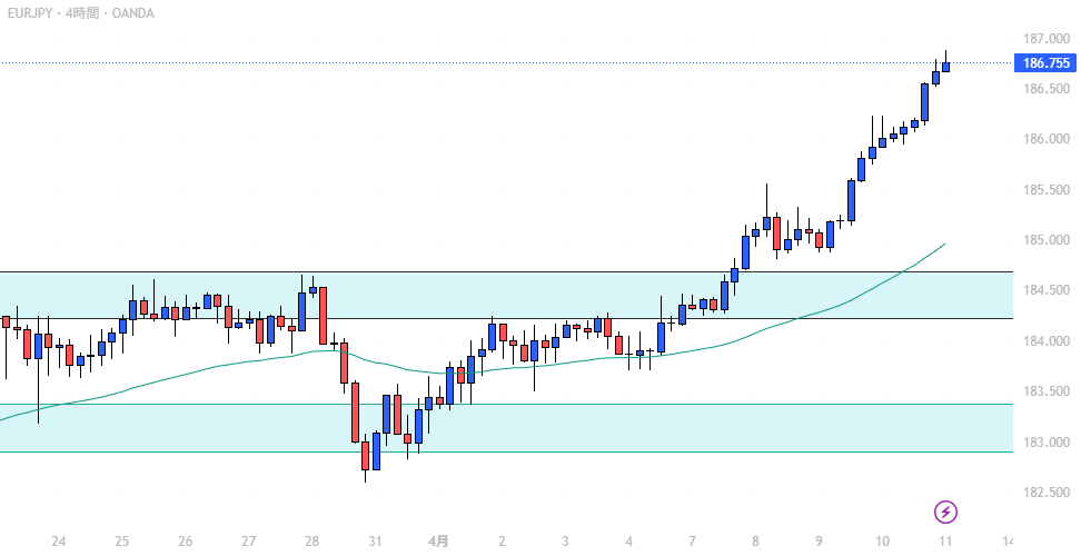序盤はAOIで抑えられていましたが、EMAがサポートとなり上昇。