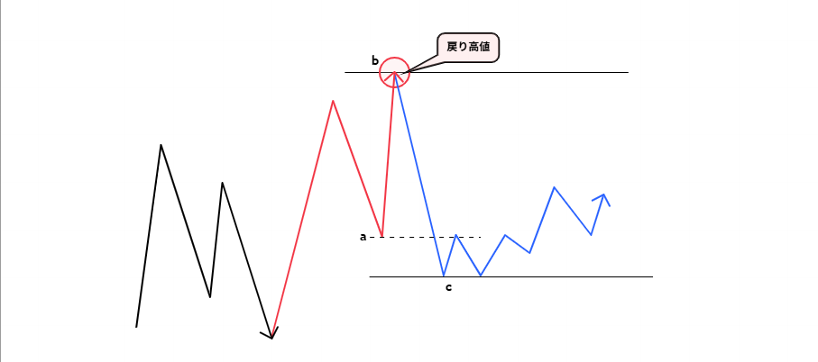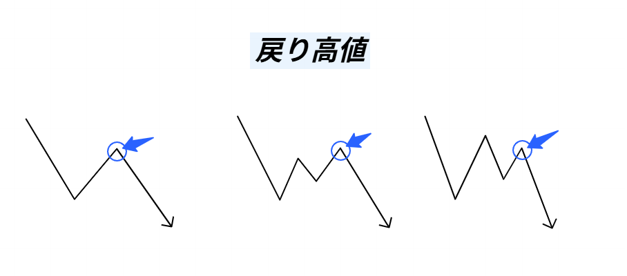 下降トレンドにおいて、直近の安値を更新した「起点となった高値」を戻り高値と呼びます。ここを上に抜けない限り、下降トレンドは継続していると判断します。