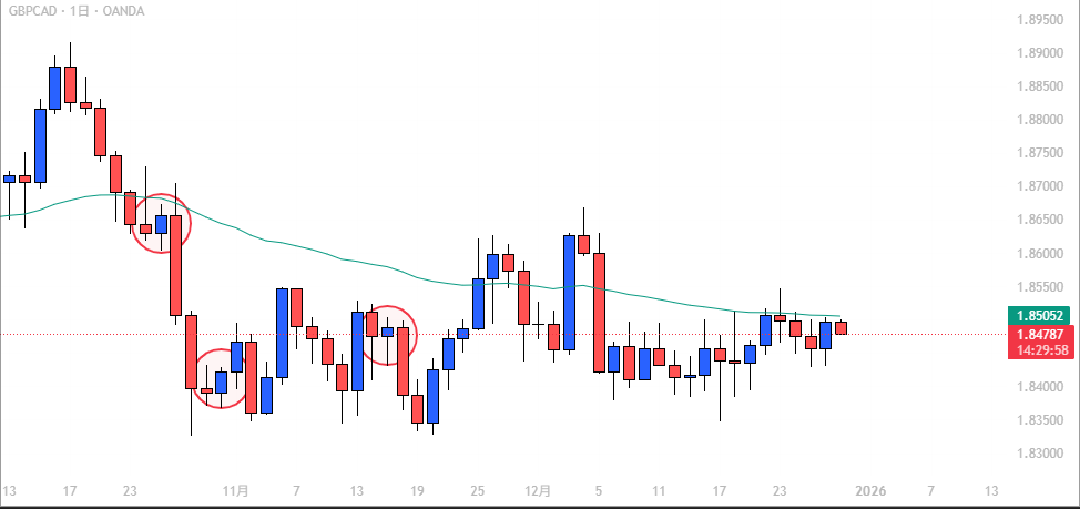 こちらは先ほどのGBP/CADの日足チャートです。ヒゲがなくなったことでチャートの形がよりシンプルになり波形を描きやすくなったと思います。